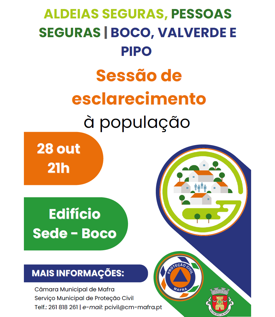 No âmbito dos programas “Aldeia Segura” e “Pessoas Seguras”, o Serviço Municipal de Proteção Civil dinamiza mais uma sessão de esclarecimento sobre medidas de autoproteção, em caso de incêndio rural. Se é residente nas localidades de Boco, Valverde e Pipo (UF Igreja Nova e Cheleiros), assista à sessão, no dia 28 de outubro (terça-feira), às 21h00, no edifício da Sociedade Desportiva e Recreativa “Os Unidos do Boco” (Igreja Nova). Entrada livre, sujeita à lotação da sala.