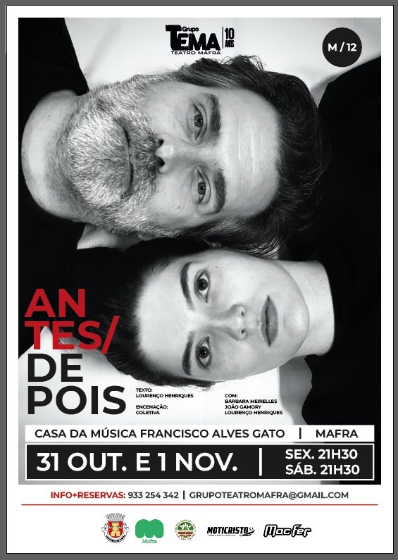 Nos próximos dias 31 de outubro e 1 de novembro, o Grupo TEMA – Teatro Mafra volta a levar a cena o espetáculo “Antes/Depois”, numa reflexão sobre o amor e as relações, o seu desenvolvimento e o seu fim. A peça sobe ao palco da Casa da Música Francisco Alves Gato (Mafra), às 21h30.