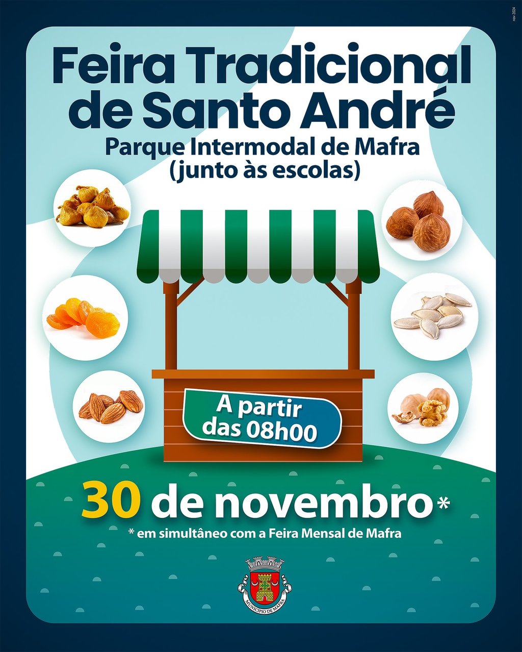 Mantendo a tradição existente, a Feira de Santo André realiza-se no dia 30 de novembro, a partir das 08h00, no Parque Intermodal da Vila de Mafra (junto às escolas).