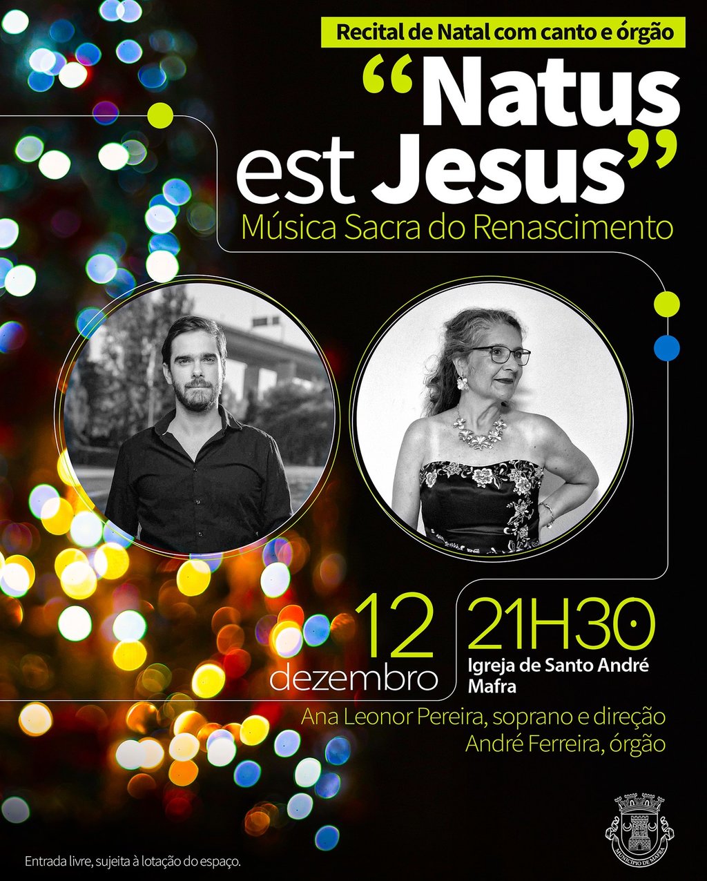 A programação de Natal traz um recital de canto e órgão à Igreja de Santo André, em Mafra! “Natus est Jesus” é uma evocação da música sacra do Renascimento, interpretado pela soprano Ana Leonor Pereira e o organista André Ferreira, no dia 12 de dezembro, às 21h30.