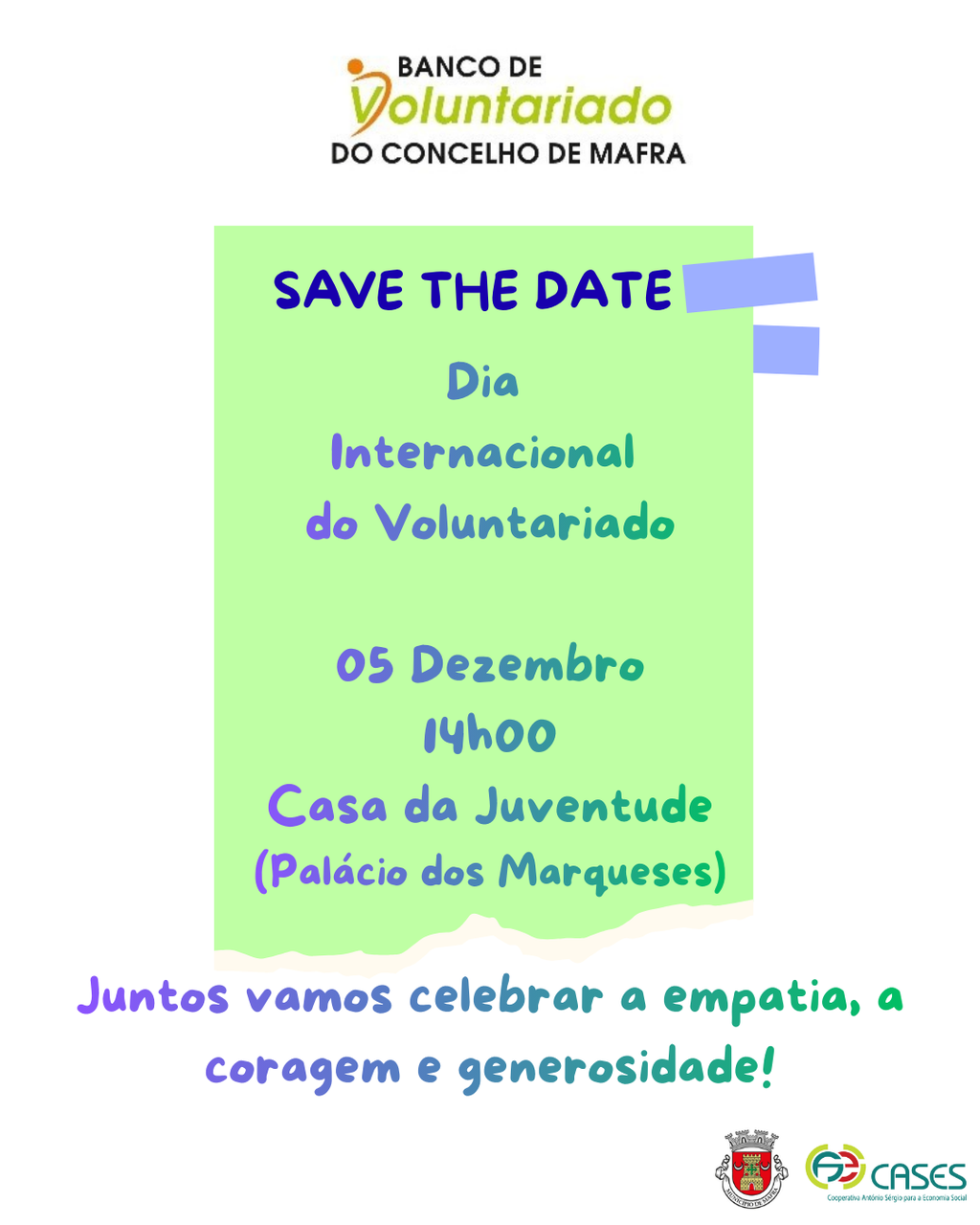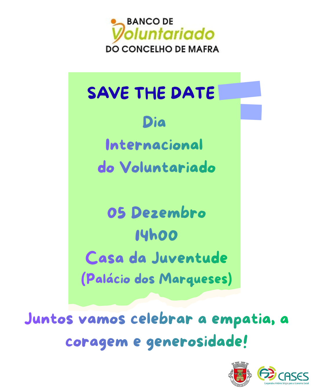 Na próxima sexta-feira, 5 de dezembro, comemoramos o Dia Internacional do Voluntariado! Se pertence ao Banco Local de Voluntariado do Município de Mafra, participe no encontro de voluntários e descubra novas experiências e testemunhos. A iniciativa está marcada para as 14h00, na GO – A Casa da Juventude (Palácio dos Marqueses, Mafra).