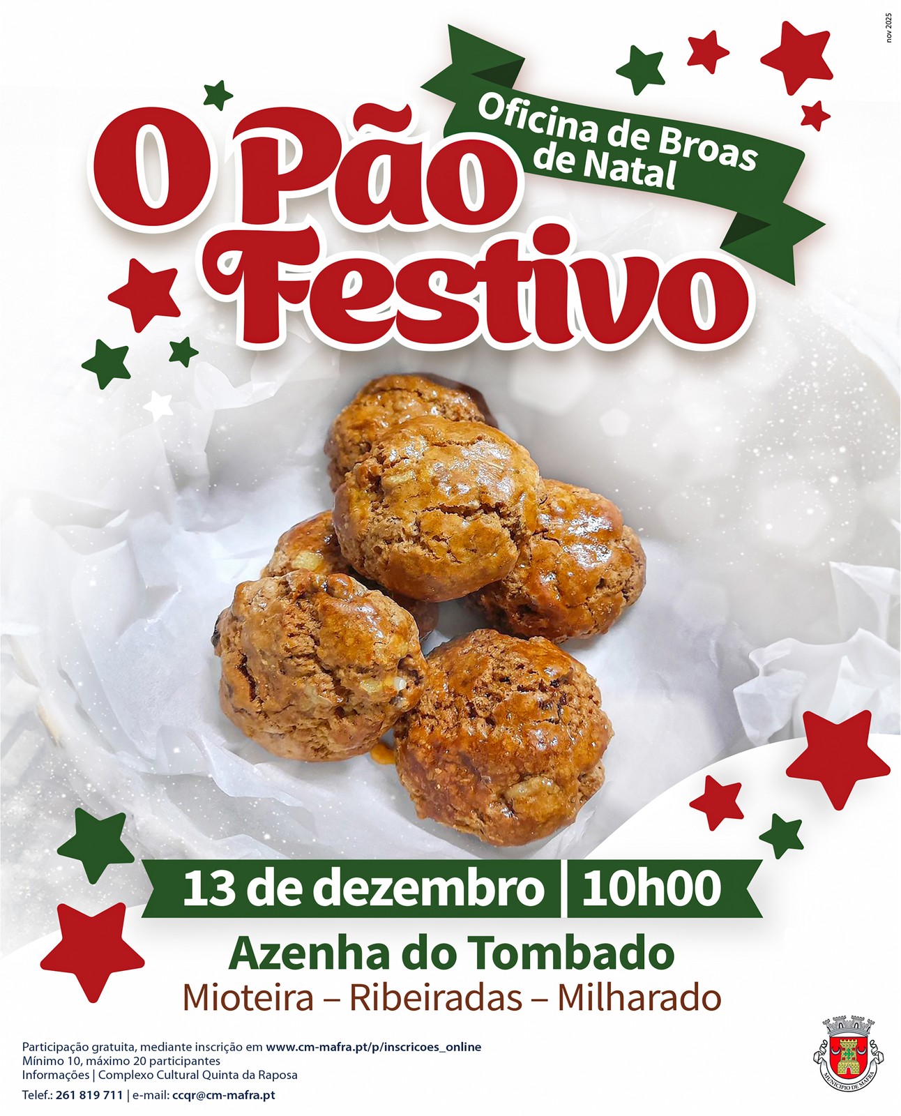 Nesta quadra, “O Pão Festivo” volta a celebrar as conhecidas broas de Natal de feição rural, uma das mais conhecidas tradições locais. Participe na oficina de fabrico de broas de Natal, orientada por grupo de pessoas da comunidade local de Vila de Canas, no dia 13 de dezembro, às 10h00, na Azenha do Tombado, na localidade de Mioteira – Ribeiradas (Freguesia do Milharado).