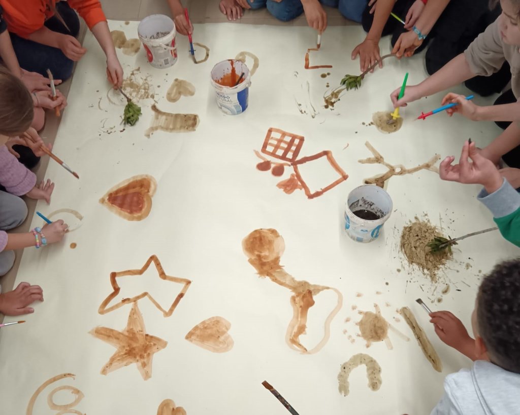 Unindo a Natureza e a Arte, as crianças descobriram o potencial artístico da lama, transformando-a em tinta para pintar, com recurso a pincéis naturais, feitos a partir de folhas e galhos.