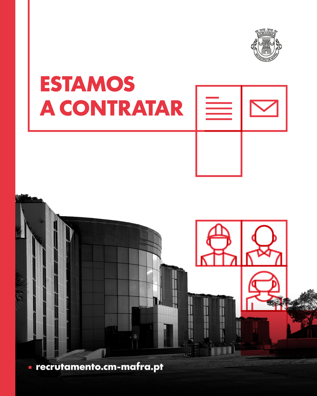 O Município de Mafra informa que procedeu à abertura de dois procedimentos concursais, com vista ao recrutamento de oito Agentes Municipais (2.ª classe - estagiários) e dois Assistentes Operacionais (área de apoio logístico a eventos). Candidaturas até ao dia 20 de janeiro, inclusive.