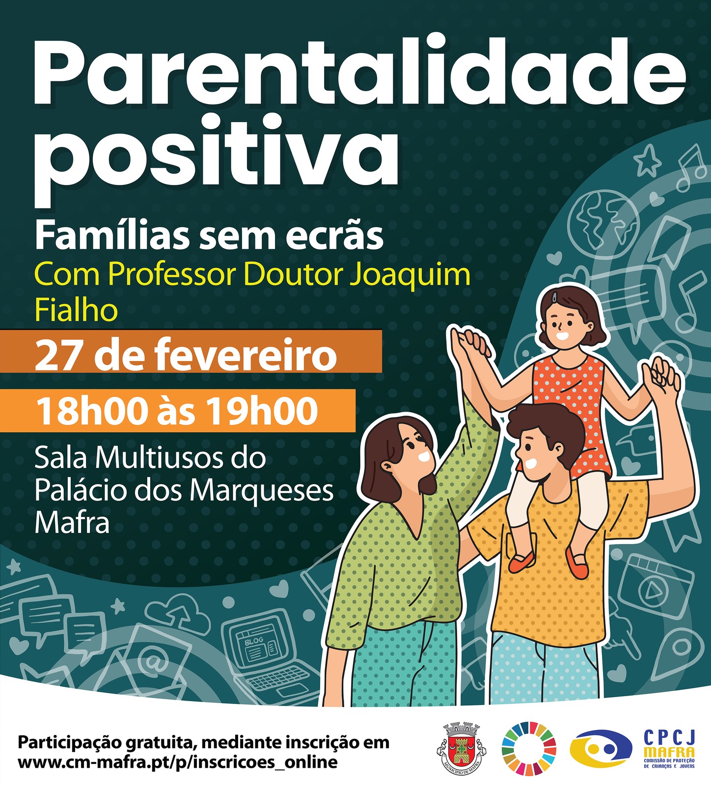 Dependência de ecrãs e o seu impacto nas relações familiares. “Famílias sem ecrãs” é o tema da próxima sessão de “Parentalidade Positiva”, dinamizada pelo Professor Doutor Joaquim Fialho, especialista em impactos de redes sociais e estratégias de intervenção social. A formação está marcada para o dia 27 de fevereiro, às 18h00, na Sala Multiusos do Palácio dos Marqueses (Mafra).
