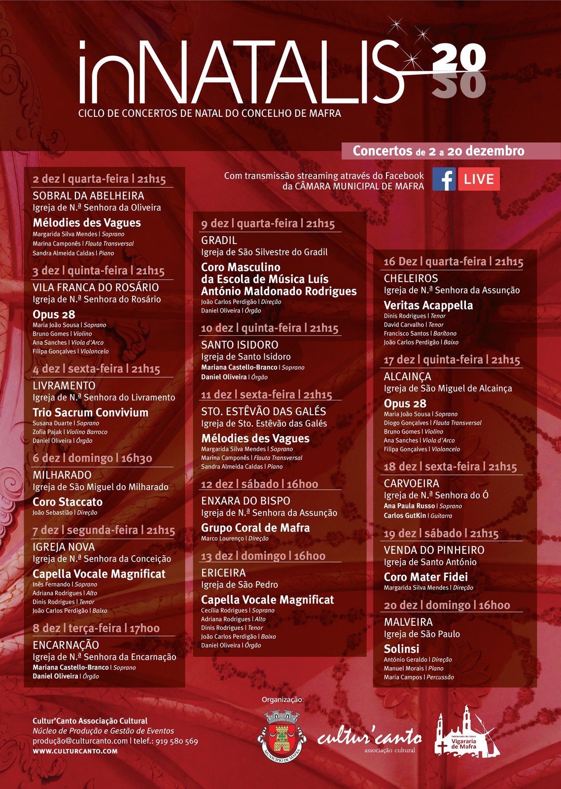 Reforçando a ancestral ligação do Concelho de Mafra à música, de 2 a 20 de dezembro, o in’Natalis apresenta uma oferta descentralizada com diversos concertos temáticos, mantendo viva uma das mais bonitas tradições da época: a interpretação de obras e canções de Natal de todos os tempos. A iniciativa integra 16 concertos, em diferentes igrejas do Concelho, aliando a beleza dos espaços com a atuação de diversos grupos musicais e coros e a utilização dos órgãos históricos existentes. Assista a estes concertos através do Facebook da Câmara Municipal de Mafra