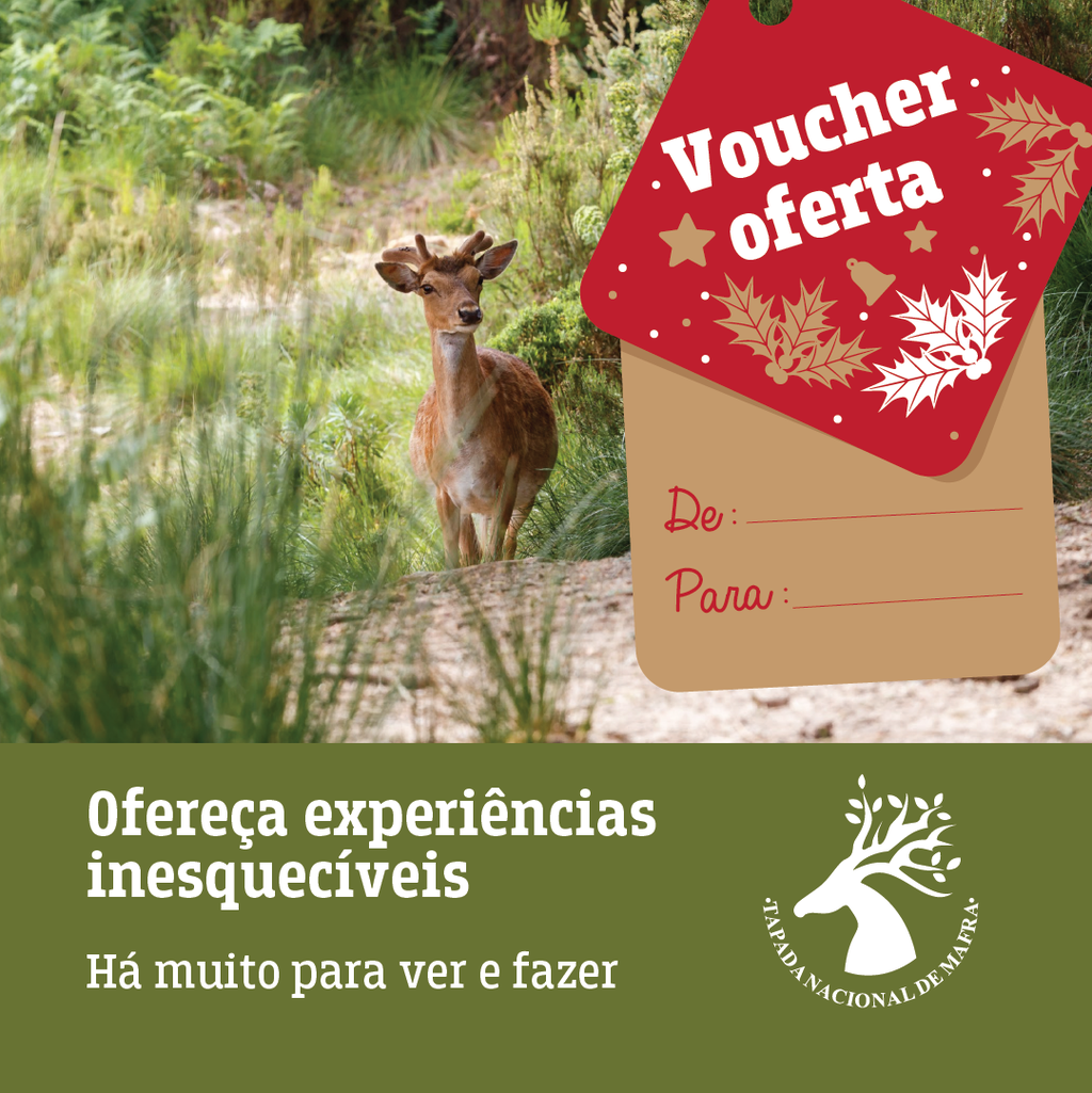 Desde casa, ofereça experiências memoráveis na Tapada Nacional de Mafra. A partir do momento em que a “experiência” pretendida se encontra disponível, a validade do voucher é de 6 meses. Este vale pode ser impresso e personalizado, transformando-se numa prenda original.