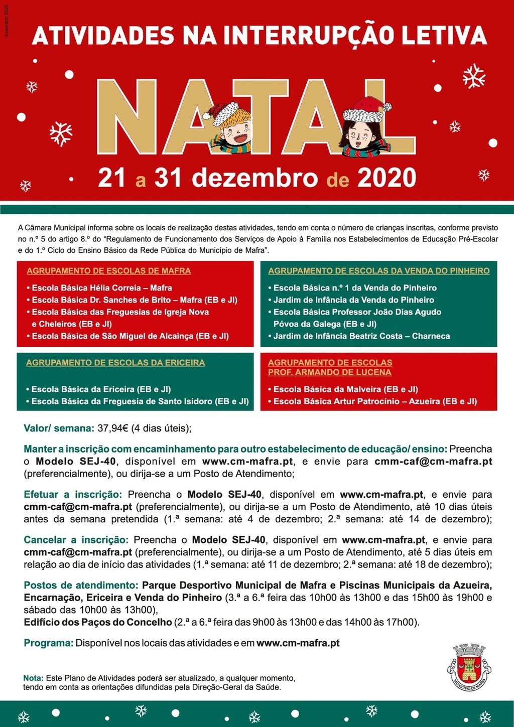 Contribuindo para a ocupação dos tempos livres durante as interrupções letivas de Natal das crianças da educação pré-escolar e do 1.º ciclo do ensino básico, de 21 a 31 de dezembro, a Câmara Municipal de Mafra organiza atividades lúdicas, desportivas e culturais, que incluem também ateliers didáticos. Estas atividades funcionam com o número mínimo de 15 crianças e decorrem entre as 7h30 e as 19h00, em diversos estabelecimentos de educação e de ensino do Concelho de Mafra.