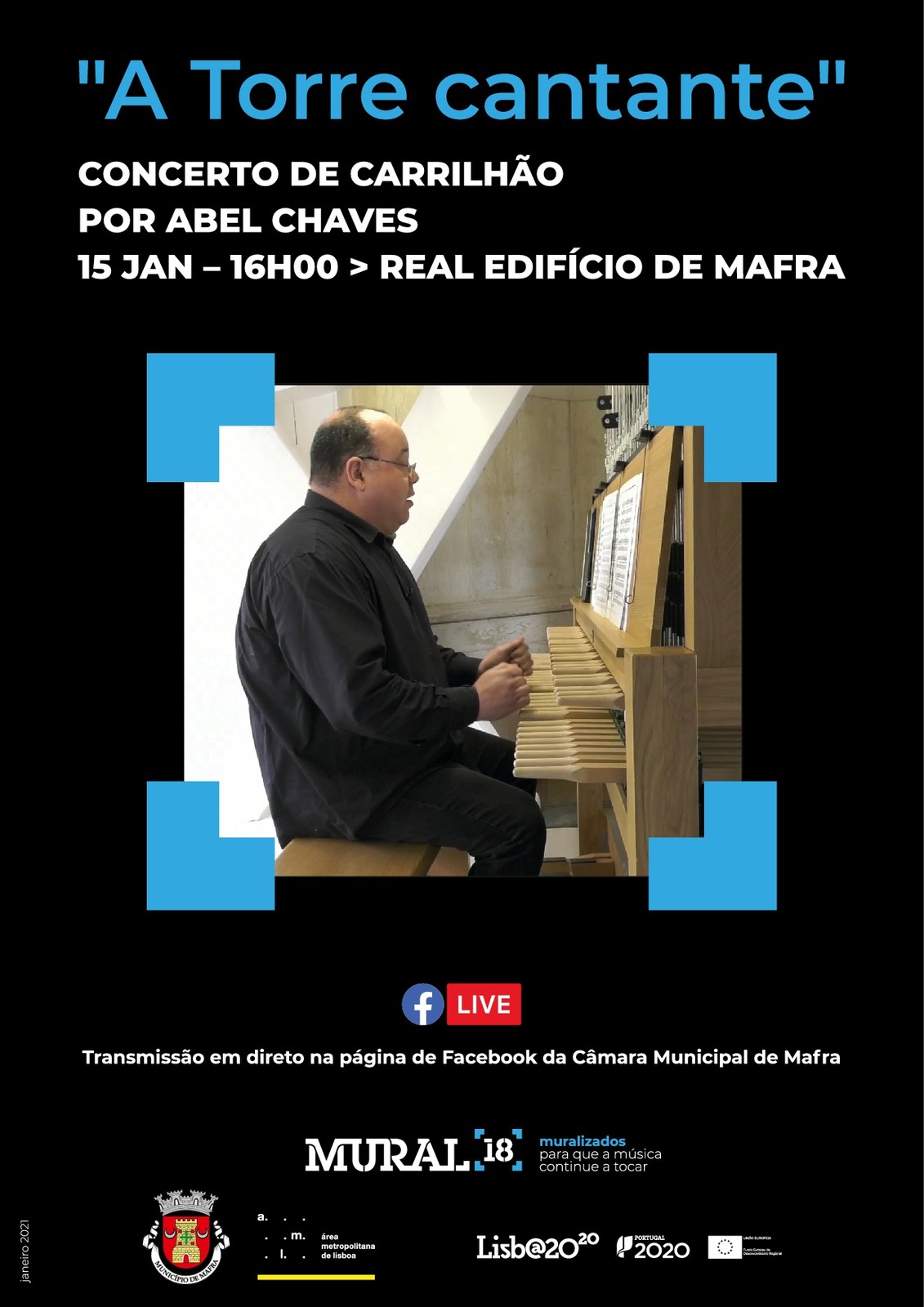 O Município de Mafra promove no próximo dia 15 de janeiro, às 16h00, um Concerto de Carrilhão por Abel Chaves, assinalando o início da programação cultural em rede do “Mural 18”. Neste espetáculo, serão interpretadas obras de Carlos Paredes, Domenico Scarlatti, Tom Jobim, entre outros. Assista através da página de Facebook da Câmara Municipal.