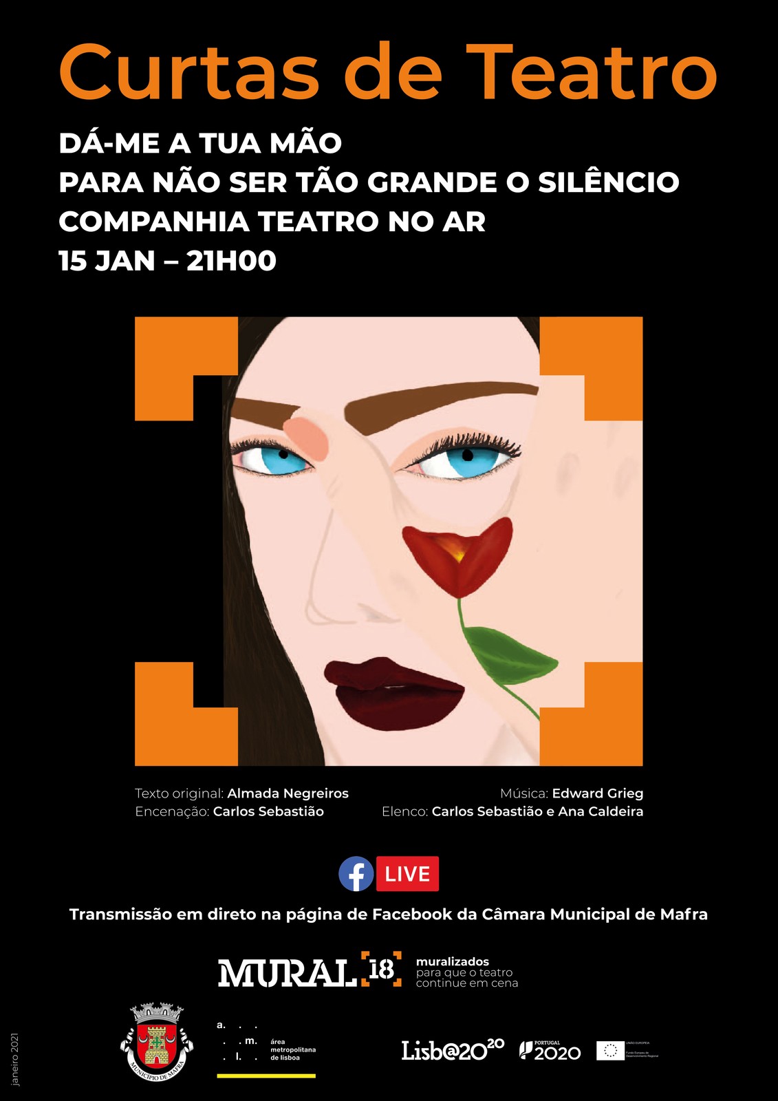 O teatro, enquanto manifestação artística, é uma das artes mais sublimes. A Câmara Municipal de Mafra, no âmbito do “Mural 18” - Programação Cultural em Rede, está a dar um importante incentivo à criação artística, dando palco e visibilidade ao trabalho desenvolvido pelos artistas do Concelho. Com transmissão, em direto, a partir da página de Facebook da Câmara Municipal de Mafra, não perca as peças “Dá-me a tua mão para não ser tão grande o silêncio”, pela Companhia Teatro no Ar, no dia 15 de janeiro, às 21h00, e “Godot”, pela Associação Meleca, no dia 16 de janeiro, às 21h00.