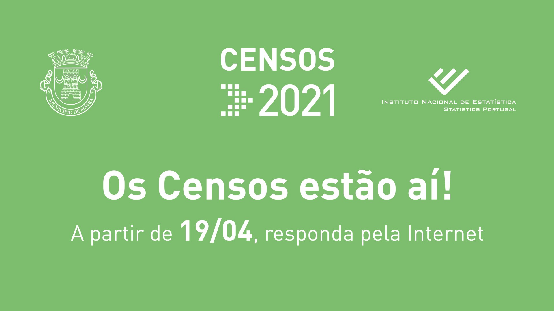 Já começaram os Censos 2021. A partir de hoje, e de preferência até 3 de maio, responda ao inquérito "online".Assista ao vídeo com a mensagem do Presidente da Câmara Municipal de Mafra.