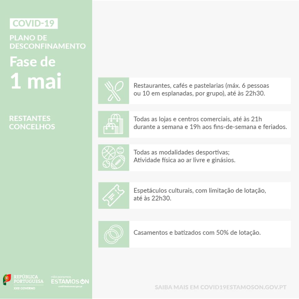 O Concelho de Mafra avança para a nova fase do plano de desconfinamento. Assim, a partir do dia 1 de maio aplicam-se as seguintes regras (para além das medidas que já vigoram desde 19 de abril):