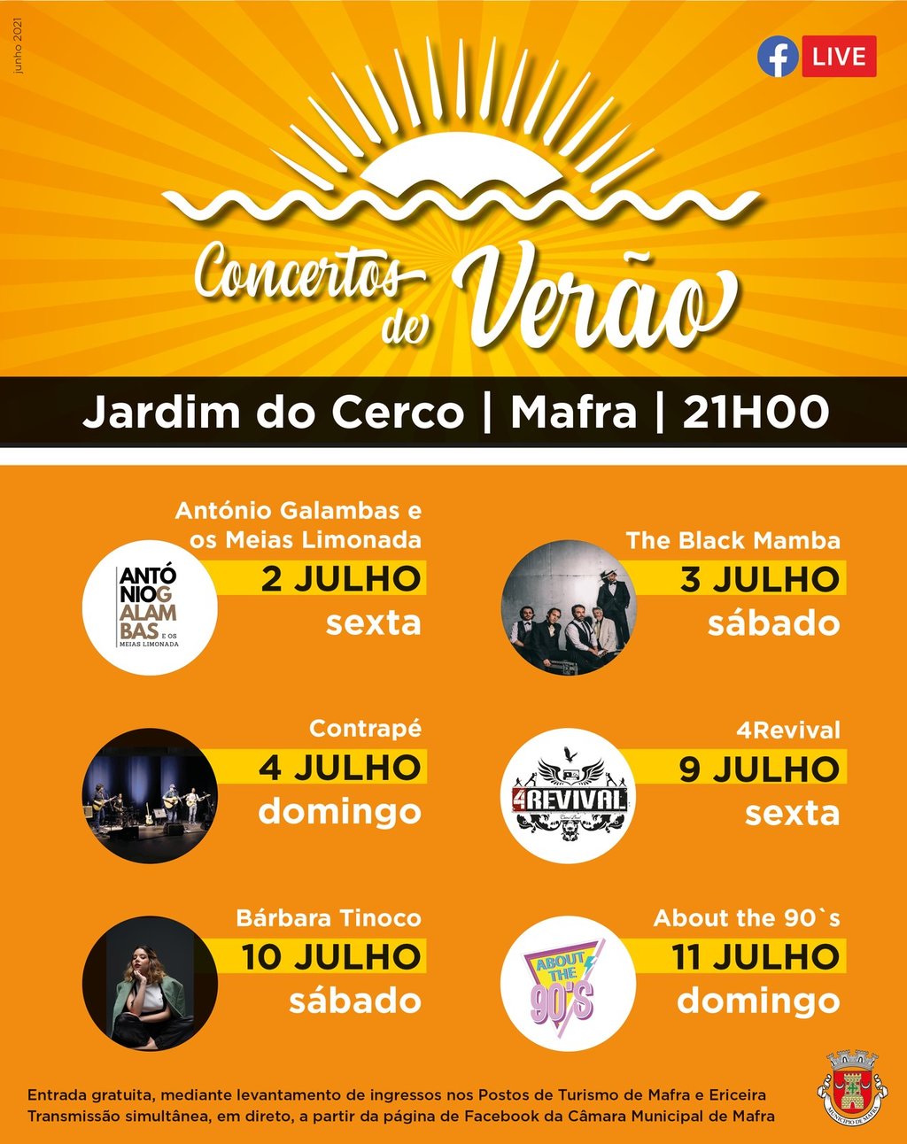 Tendo como cenário o Jardim do Cerco, Património Mundial da UNESCO, a música anima as noites de verão... Assista, presencialmente, mediante levantamento de ingressos gratuitos nos Postos de Turismo de Mafra e Ericeira. O número de lugares é limitado, em respeito pelas regras sanitárias em contexto pandémico. É obrigatório o uso de máscara. Em alternativa, assista digitalmente, através da página de Facebook da Câmara Municipal de Mafra.