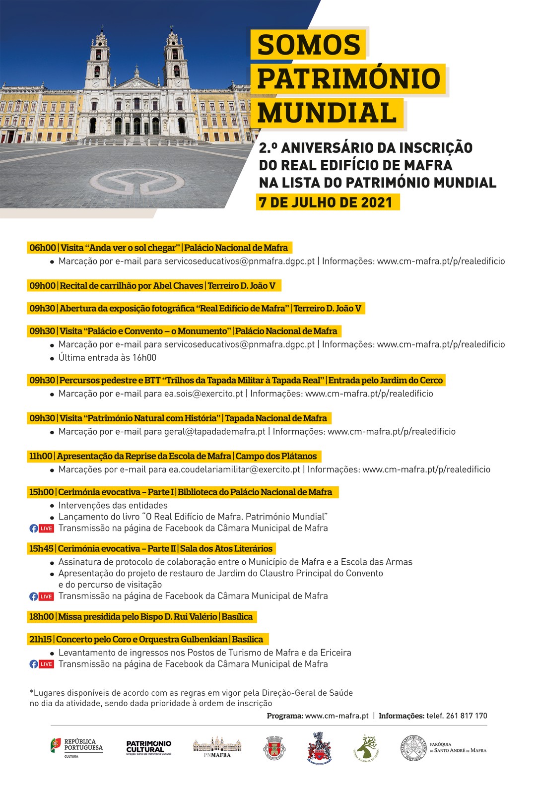 No âmbito das comemorações segundo aniversário da inscrição do Real Edifício de Mafra – Palácio, Basílica, Convento, Jardim do Cerco e Tapada – na lista do Património Mundial da UNESCO, realiza-se, na Basílica, um concerto pelo Coro e Orquestra Gulbenkian, com o barítono Sergei Leiferkus, sob a direção dos maestros Nuno Coelho e Jorge Matta, no dia 7 de julho, às 21h15m. Assista presencialmente, mediante levantamento de ingressos, ou digitalmente, através da página de Facebook da Câmara Municipal de Mafra.