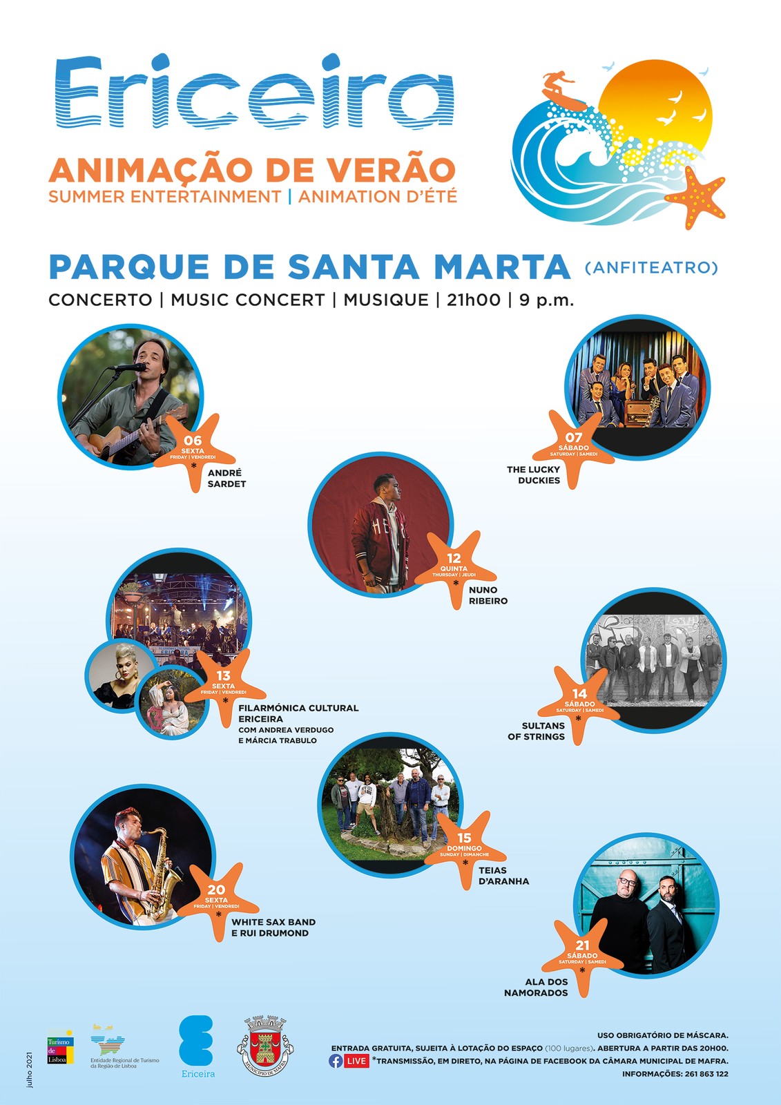 As noites de verão na Ericeira contam com mais música. No anfiteatro do Parque de Santa Marta atuam reputados nomes do panorama nacional, bem como artistas do nosso concelho. De 6 a 21 de agosto, realizam-se oito concertos, às 21h00. Com abertura do recinto a partir das 20h00, a entrada é gratuita, sujeita à lotação do espaço, sendo disponibilizados 100 lugares, no cumprimento das normas da Direção-geral da Saúde. Em alternativa, assista digitalmente, através da página de Facebook da Câmara Municipal de Mafra.