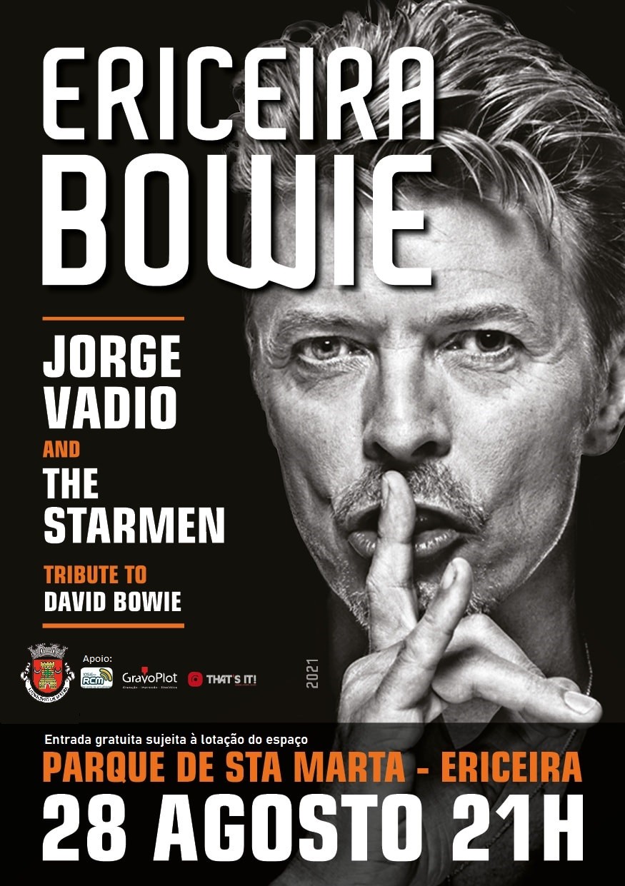 No âmbito da Animação de Verão na Ericeira, realiza-se no próximo dia 28 de agosto, às 21h00, no anfiteatro do Parque de Santa Marta, o espetáculo "Ericeira Bowie – Tribute to David Bowie”, protagonizado por Jorge Vadio and The Starmen. O concerto gratuito tem entrada sujeita à lotação do espaço, no cumprimento das normas da Direção-Geral da Saúde, com abertura do recinto a partir das 20h00. Uso de máscara obrigatório.