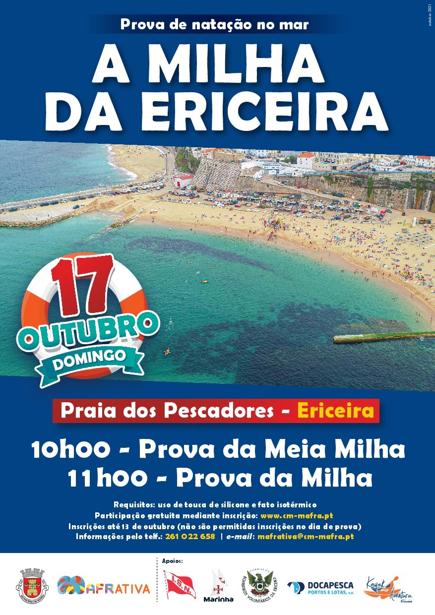 Participe na "Milha da Ericeira", uma prova de natação no mar. A Praia dos Pescadores, na Ericeira, recebe, no dia 17 de outubro, a partir das 10h00, a competição que decorre em duas distâncias, meia milha e uma milha náutica. A participação é gratuita, mediante inscrição até dia 13 de outubro.