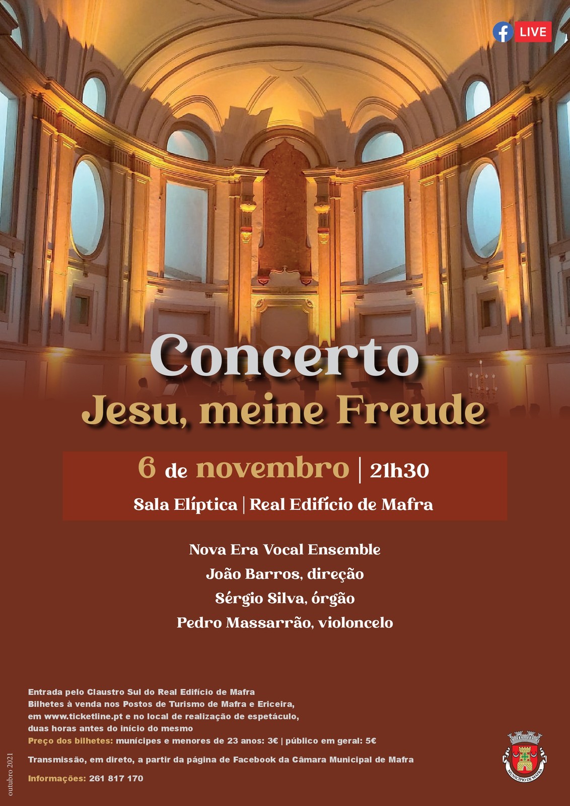A Sala Elíptica do Real Edifício de Mafra abre portas para um simbólico concerto intitulado “Jesu, Meine Freude”, que se realiza no dia 6 de novembro às 21h30. O espetáculo será protagonizado pelo Nova Era Vocal Ensemble, acompanhado no órgão, por Sérgio Silva, e no violoncelo, por Pedro Massarrão, com direção de João Barros.