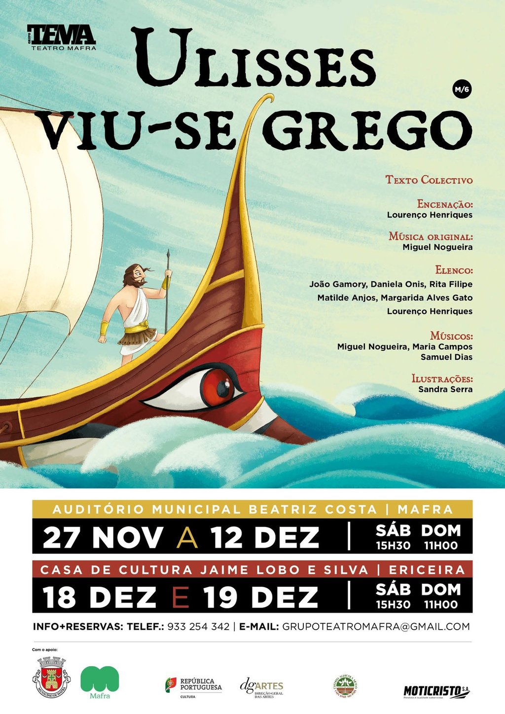 O Auditório Municipal Beatriz Costa, em Mafra, recebe a peça de teatro infantil “Ulisses viu-se Grego”, numa adaptação livre do clássico “Odisseia” de Homero. O espetáculo, que é a vigésima produção do Grupo TEMA – Teatro Mafra, realiza-se de 27 de novembro a 12 de dezembro, aos sábados (15h30) e domingos (11h00).