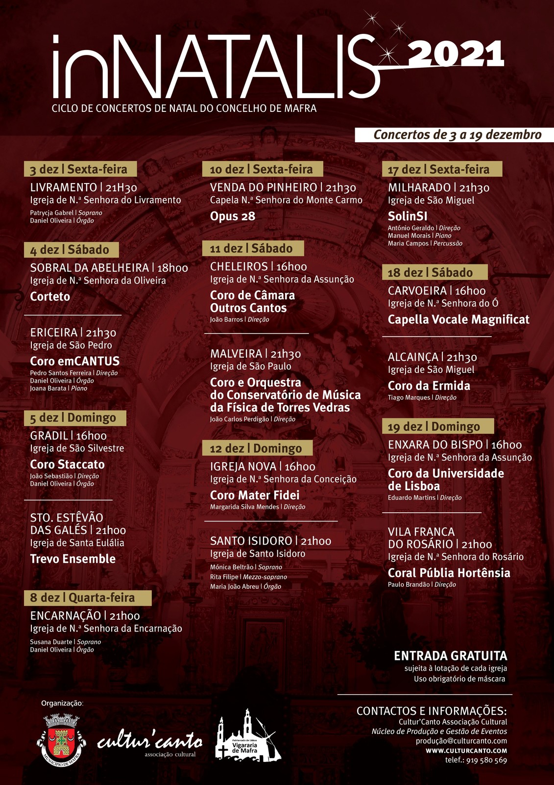 O Ciclo de Concertos “inNatalis”, organizado pela Câmara Municipal de Mafra, Cultur’canto e Vigararia de Mafra, integra 16 concertos, em diferentes igrejas do Concelho, aliando a beleza dos espaços com a atuação de diversos grupos musicais e coros e a utilização dos órgãos históricos existentes.