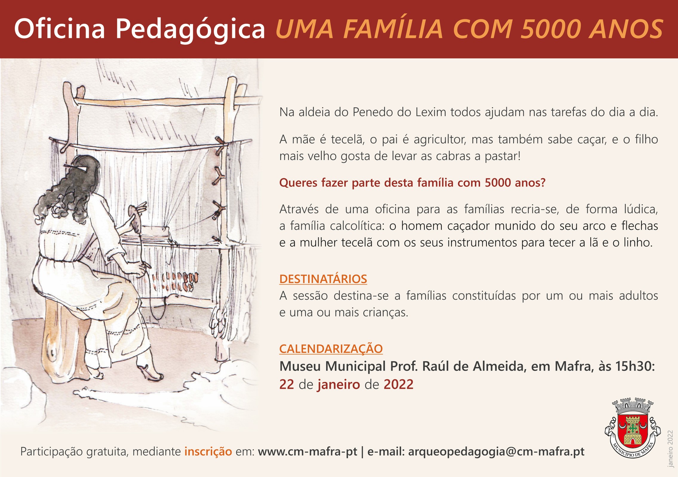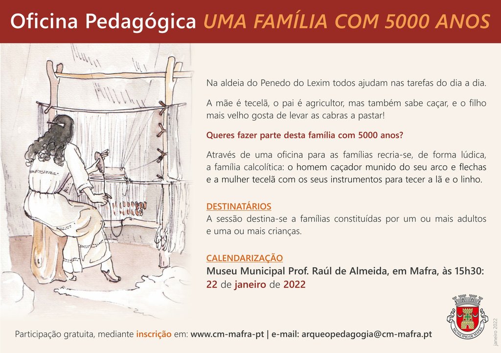 Venha conhecer, de forma lúdica, “Uma família com 5000 anos”, do Período Calcolítico, através de uma oficina pedagógica. A iniciativa realiza-se no Museu Municipal Prof. Raúl de Almeida, em Mafra, no dia 22 de janeiro, às 15h30. A participação é gratuita, mediante inscrição.