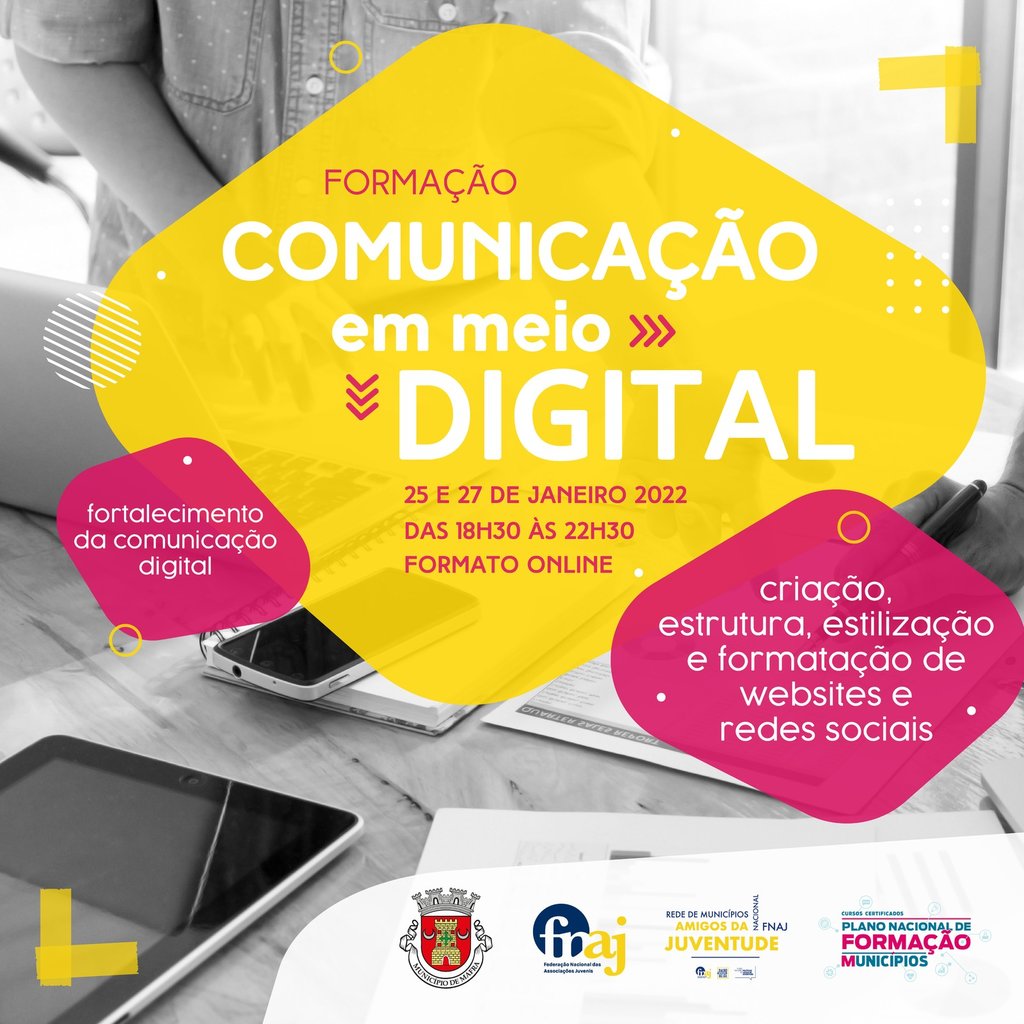 De 25 de janeiro a 21 de abril, a Câmara Municipal de Mafra, na qualidade de membro efetivo na Rede Nacional de Municípios de Amigos da Juventude, em colaboração com a Federação Nacional de Associações Juvenis (FNAJ), promove a realização de ações de formação, para jovens dos 15 aos 30 anos, que decorrem, em formato online, entre as 18h30 e as 22h30. A primeira sessão, sobre “Comunicação em meio digital”, realiza-se nos dias 25 e 27 de janeiro. A participação é gratuita, mediante inscrição em: https://www.cm-mafra.pt/pages/2062