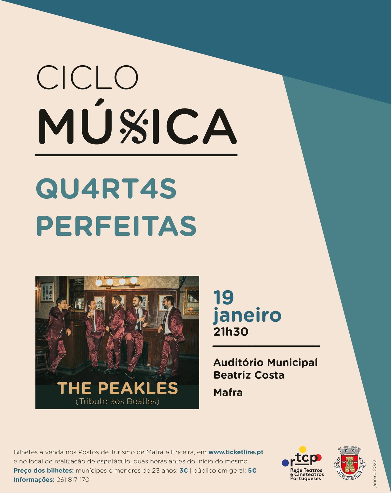 Os bilhetes estão disponíveis nos Postos de Turismo de Mafra e Ericeira, em https://ticketline.sapo.pt/evento/the-peakles-ciclo-quartas-perfeitas-60899 ou no local de realização dos espetáculos, duas horas antes do início dos mesmos. Preço dos bilhetes: Munícipes e menores de 23 anos: 3€ | público em geral: 5€