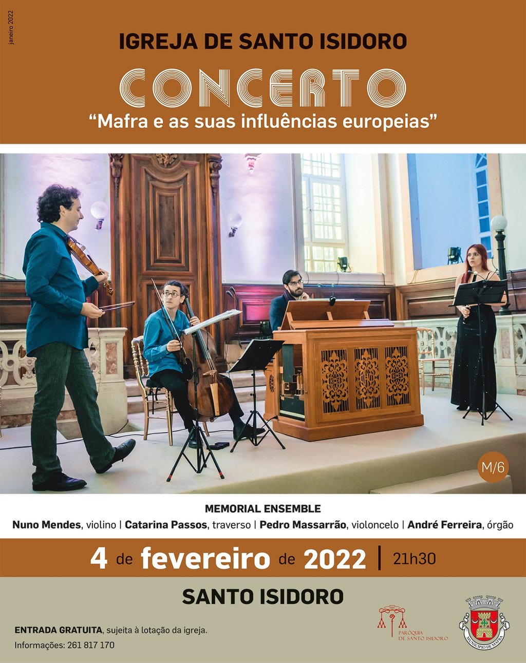 “Mafra e as suas influências europeias” é o tema do concerto interpretado pelo Memorial Ensemble, constituído por Nuno Mendes (violino), Catarina Passos (traverso), André Ferreira (órgão) e Pedro Massarrão (violoncelo), que se realiza no dia 4 de fevereiro, pelas 21h30, na Igreja de Santo Isidoro. Esta é uma organização da Câmara Municipal de Mafra, com apoio da Paróquia de Santo Isidoro. A entrada é gratuita, sujeita à lotação da igreja.