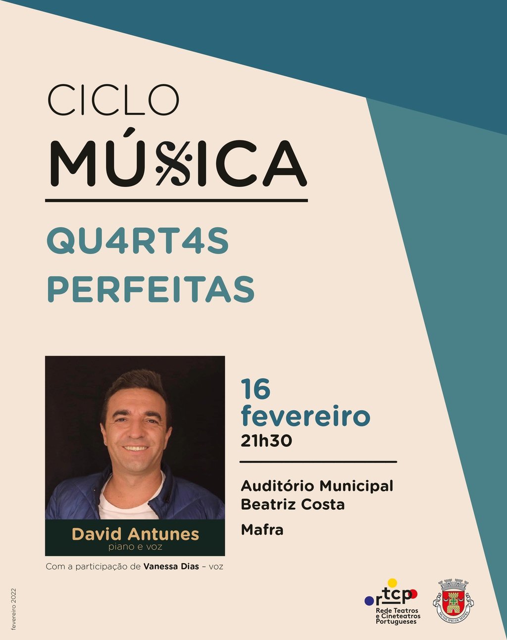 O terceiro concerto do Ciclo de Música “Quartas Perfeitas” realiza-se no dia 16 de fevereiro, pelas 21h30, no Auditório Municipal Beatriz Costa, em Mafra. Sobe ao palco David Antunes, no piano e voz, acompanhado por Vanessa Dias, na voz.