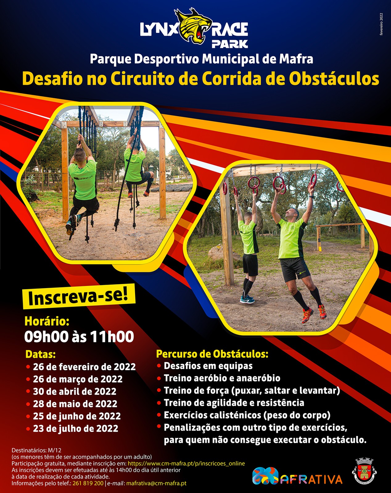 Gosta de treinar em equipa e ao ar livre? Participe no desafio no LynxRace Park, o circuito de corrida de obstáculos do Parque Desportivo Municipal de Mafra. Os treinos realizam-se das 9h00 às 11h00, nos sábados, 26 de fevereiro, 26 de março, 30 de abril, 28 de maio, 25 de junho e 23 de julho. A participação é gratuita, mediante inscrição em: https://www.cm-mafra.pt/pages/2091