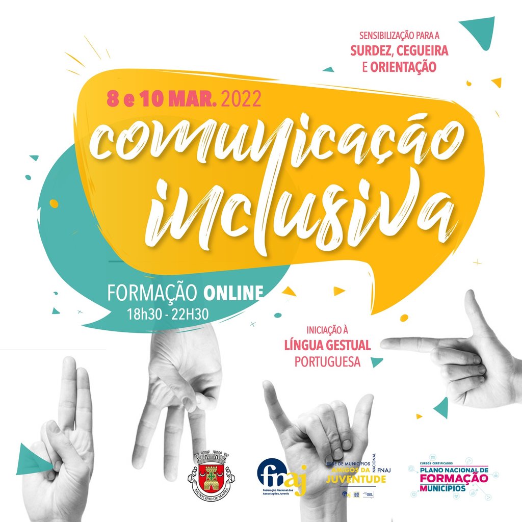 A ação de formação “Comunicação inclusiva – Integração de pessoas surdas e cegas nas associações juvenis”, no âmbito da iniciativa “Capacitar+ Juventude”, realiza-se, em formato online, nos dias 8 e 10 de março, entre as 18h30 e as 22h30, destinando-se a jovens dos 15 aos 30 anos. A iniciativa visa a formação e sensibilização de dirigentes associativos, voluntários e técnicos de juventude, sendo a participação gratuita, mediante inscrição, até dia 2 de março, em: https://www.cm-mafra.pt/pages/2062