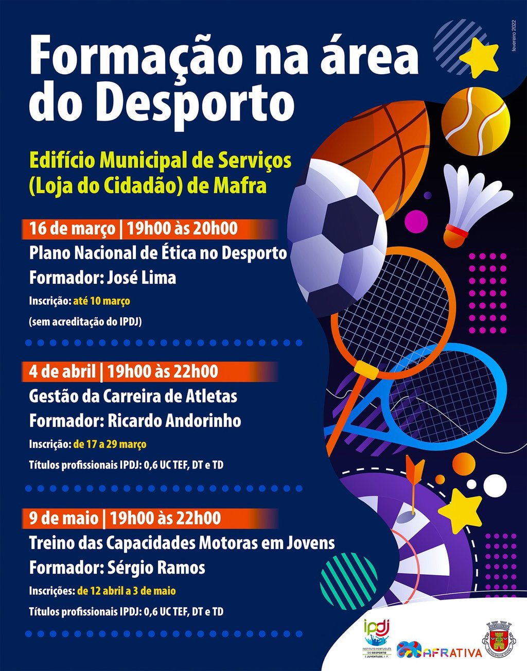 Nos dias 16 de março, 4 de abril e 9 de maio, a Câmara Municipal de Mafra, com o apoio do Instituto Português do Desporto e Juventude (IPDJ), promove a realização de ações de formação, destinadas a profissionais e estudantes nas diversas áreas do Desporto - Educação Física e Desporto, Ciências do Desporto, Exercício e Bem-Estar e Treino Desportivo, assim como detentores dos Títulos Profissionais de Técnico de Exercício Físico (TEF), Diretor Técnico (DT) e Treino Desportivo (TD).