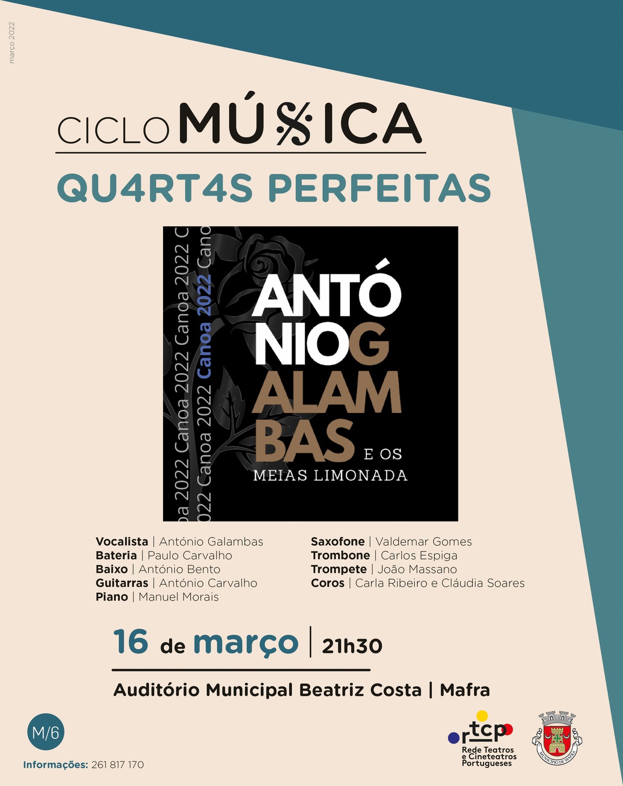 O quinto concerto do Ciclo de Música “Quartas Perfeitas” traz, no dia 16 de março, pelas 21h30, “António Galambas e os Meias Limonada” ao palco do Auditório Municipal Beatriz Costa, em Mafra. António Galambas, vocalista, Paulo Carvalho, na bateria, António Bento, no baixo, António Carvalho, nas guitarras, Manuel Morais, no piano, Valdemar Gomes, no saxofone, Carlos Espiga, no trombone, João Massano, no trompete, Carla Ribeiro e Cláudia Soares, nos coros, integram este grupo.