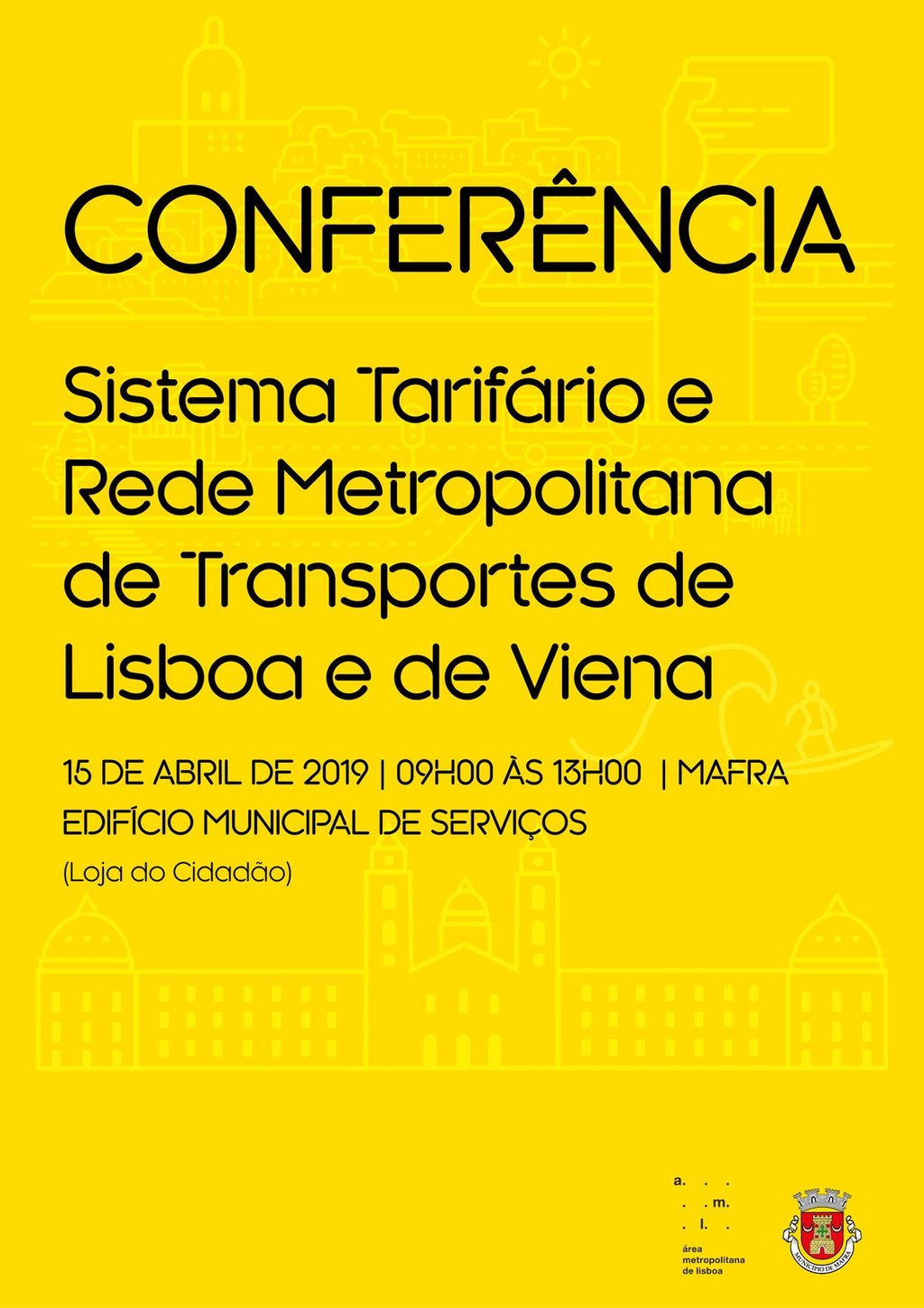 A Área Metropolitana de Lisboa e a Câmara Municipal de Mafra organizam a Conferência "Sistema Tarifário e Rede Metropolitana de Transportes de Lisboa e de Viena", que se realiza no dia 15 de abril, das 9 às 13 horas, no Edifício Municipal de Serviços (Loja do Cidadão), em Mafra. A iniciativa tem como destinatários o público em geral, com interesse na área da mobilidade e dos transportes, assim como eleitos e técnicos municipais. A inscrição é gratuita, limitada à capacidade da sala, mediante o preenchimento do respetivo formulário.