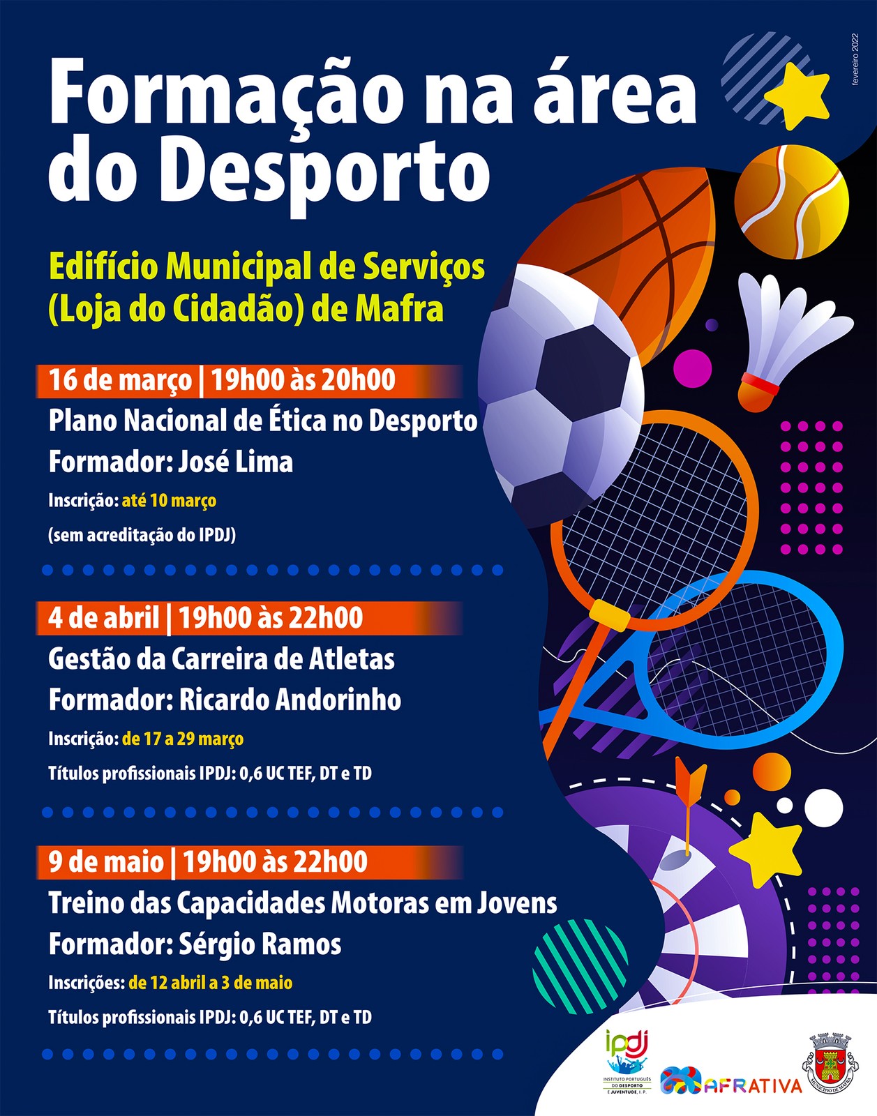 A Câmara Municipal de Mafra promove a realização de uma ação de formação, orientada por Sérgio Ramos, sobre “Treino das Capacidades Motoras em Jovens” e destinada a profissionais e estudantes nas diversas áreas do Desporto - Educação Física e Desporto, Ciências do Desporto, Exercício e Bem-Estar e Treino Desportivo, assim como detentores dos Títulos Profissionais de Técnico de Exercício Físico (TEF), Diretor Técnico (DT) e Treino Desportivo (TD). A iniciativa realiza-se no dia 9 de maio, das 19h00 às 22h00, no Edifício Municipal de Serviços (Loja do Cidadão) de Mafra, sendo acreditada pelo Instituto Português do Desporto e Juventude (IPDJ).