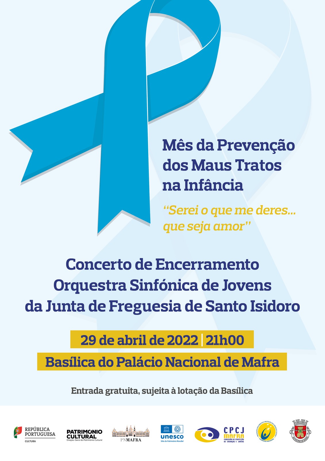 A Comissão de Proteção de Crianças e Jovens (CPCJ) de Mafra assinala o encerramento do Mês da Prevenção dos Maus Tratos na Infância, subordinado ao tema “Serei o que me deres… que seja amor”, com um concerto pela Orquestra Sinfónica de Jovens da Junta de Freguesia de Santo Isidoro, que se realiza no dia 29 de abril, às 21 horas, na Basílica do Palácio Nacional de Mafra. A entrada gratuita, sujeita à lotação da basílica.