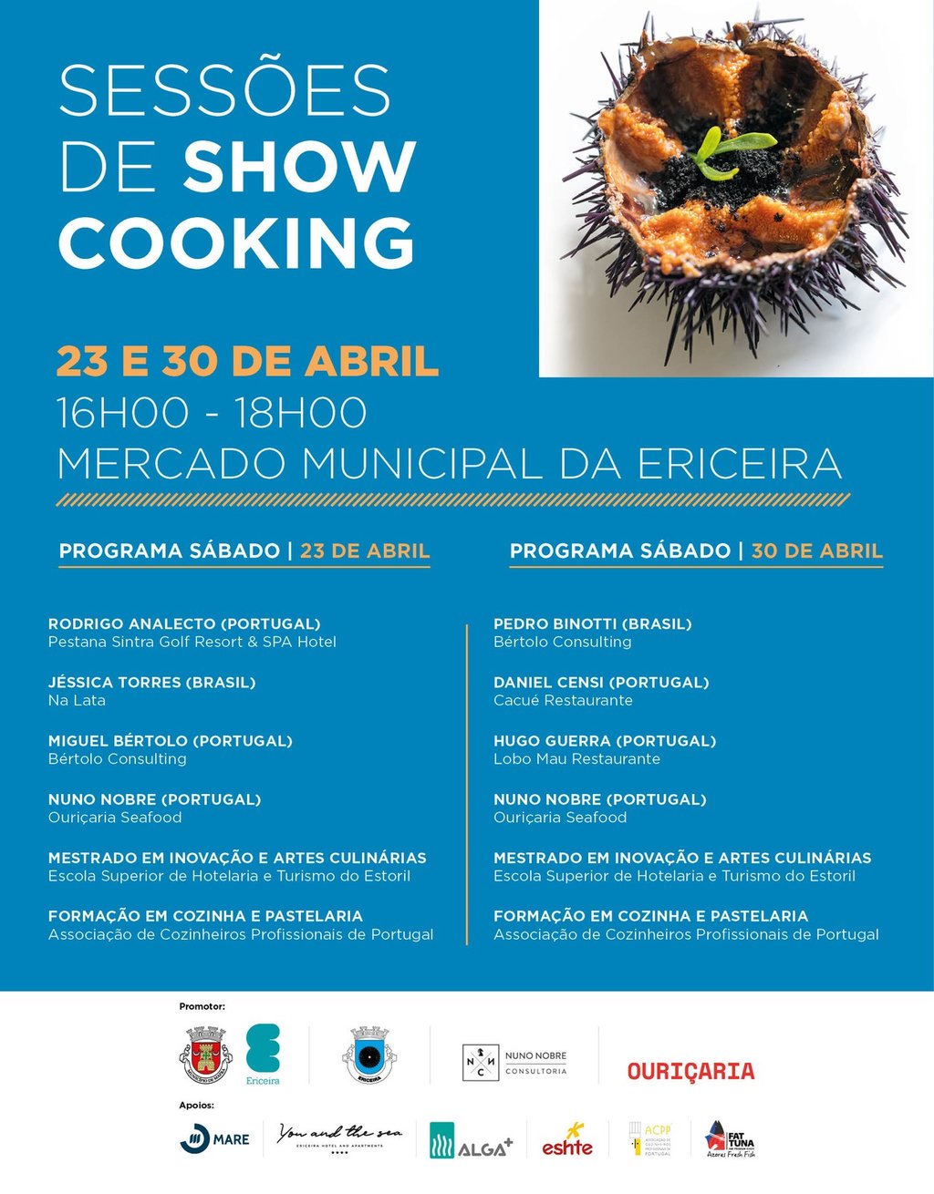 No âmbito do 6.º Festival Internacional do Ouriço-do-Mar, no dia 30 de abril, das 16h00 às 18h00, regressam ao Mercado Municipal da Ericeira, showcooking e degustações com a presença de representantes do Mestrado em Inovação e Artes Culinárias da Escola Superior de Turismo e Hotelaria do Estoril, representantes da Formação em Cozinha e Pastelaria da Associação de Cozinheiros Profissionais de Portugal e dos chefs Pedro Binotti, Daniel Censi, Hugo Guerra, para além de Nuno Nobre.
