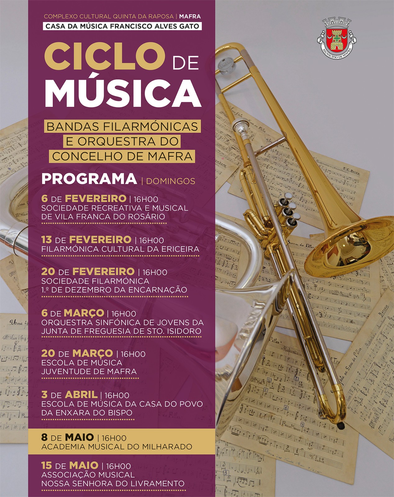 O sétimo concerto da sexta edição do Ciclo de Música “Bandas Filarmónicas e Orquestra do Concelho de Mafra” realiza-se no dia 8 de maio, pelas 16h00, sendo protagonizado pela Academia Musical do Milharado, sob a direção de Luciano Franco. A entrada é gratuita, mas sujeita à lotação da sala.