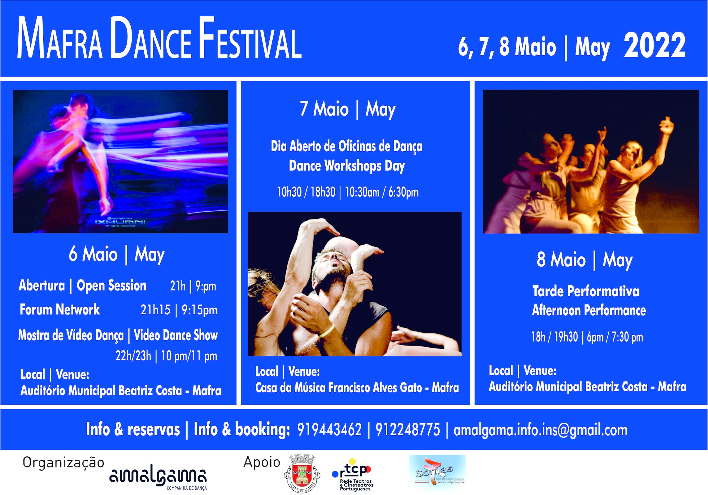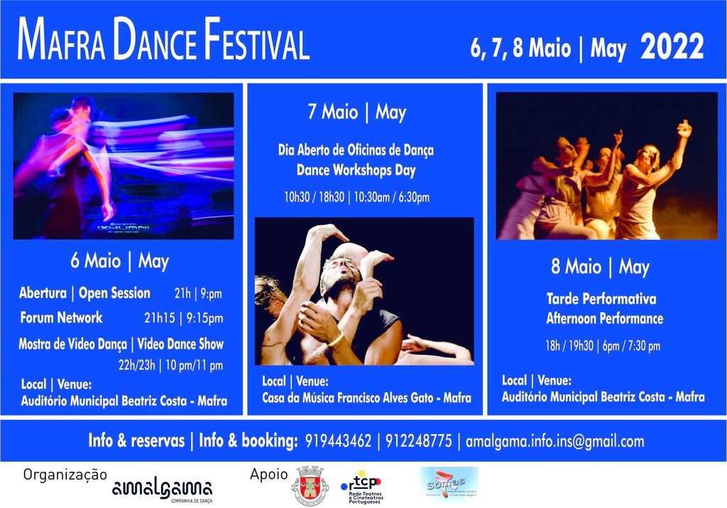 A Câmara Municipal de Mafra organiza o Mafra Dance Festival, em parceria com a Companhia de Dança Amalgama. O evento está marcado para os dias 6 a 8 de maio, com espetáculos no Auditório Municipal Beatriz Costa e na Casa da Música Francisco Alves Gato, em Mafra.