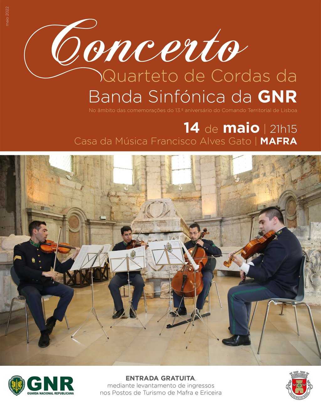 A Casa da Música Francisco Alves Gato, em Mafra, recebe amanhã, às 21h15, um concerto pelo Quarteto de Cordas da Banda Sinfónica da Guarda Nacional Republicana (GNR).
