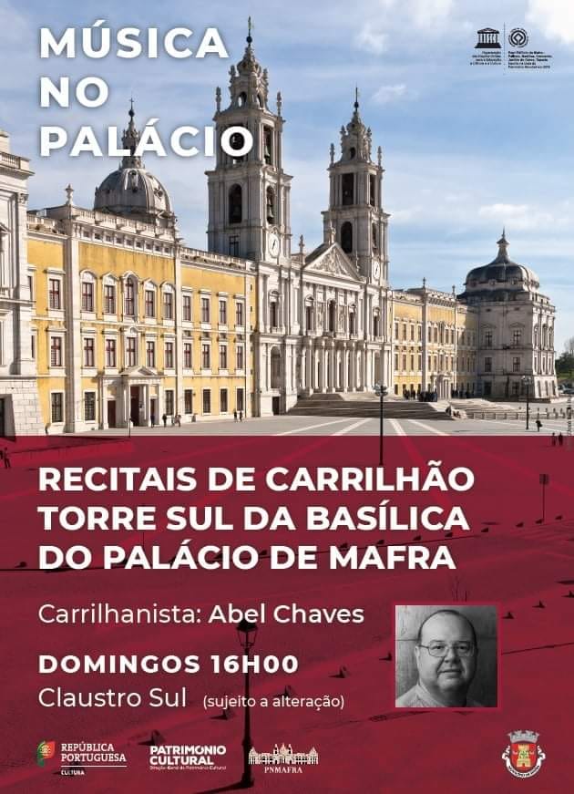 Realiza-se no domingo, dia 22 de maio, pelas 16 horas, um concerto de carrilhão. O público pode ouvir, no Claustro Sul do Real Edifício de Mafra, alguns sucessos da música popular, intercalados com grandes clássicos da música portuguesa e internacional, interpretados pelo carrilhanista Abel Chaves.