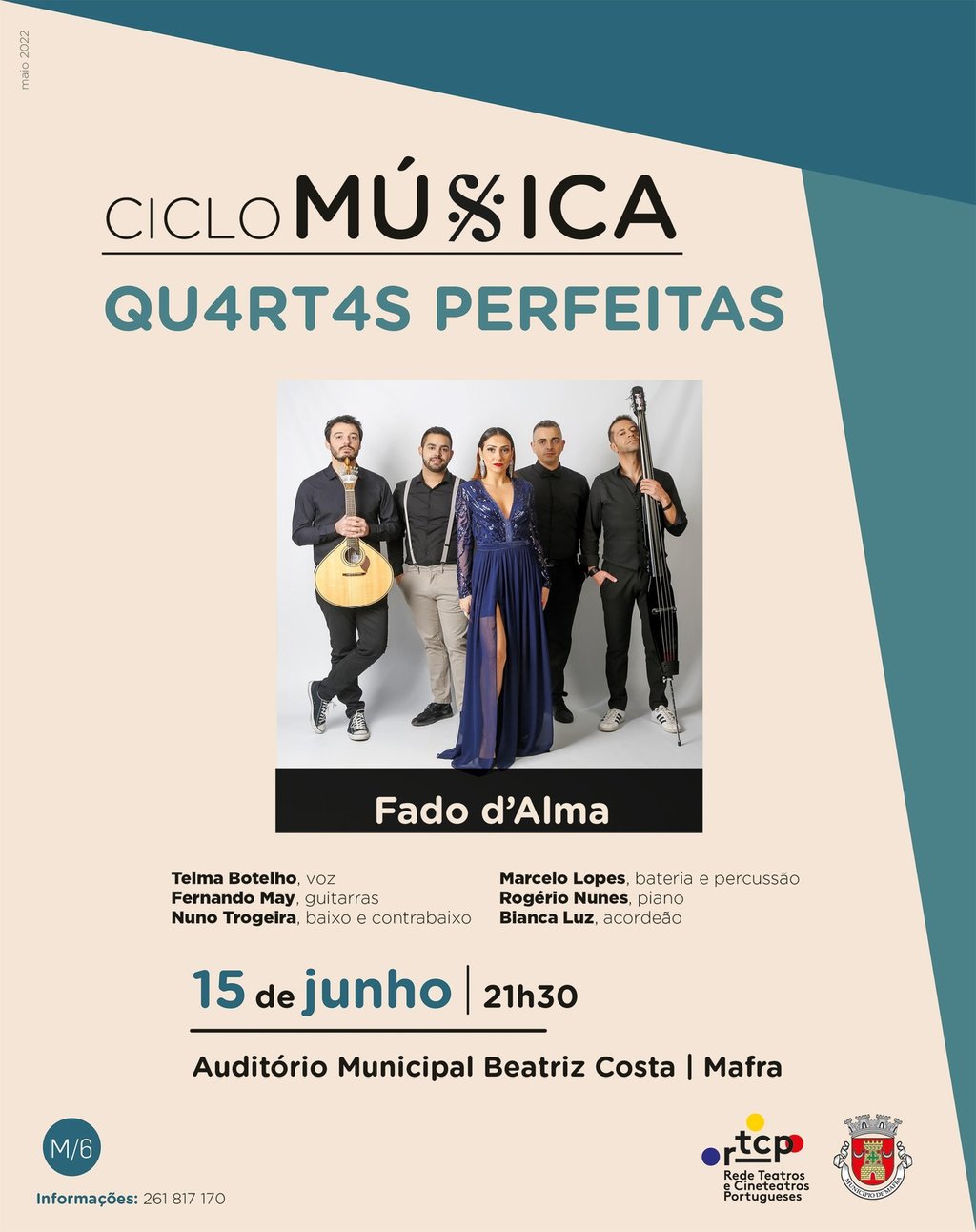 O Ciclo de Música “Quartas Perfeitas” apresenta mais um concerto, protagonizado pelo grupo Fado D’Alma, agendado para o dia 15 de junho, às 21h30, no Auditório Municipal Beatriz Costa, em Mafra.