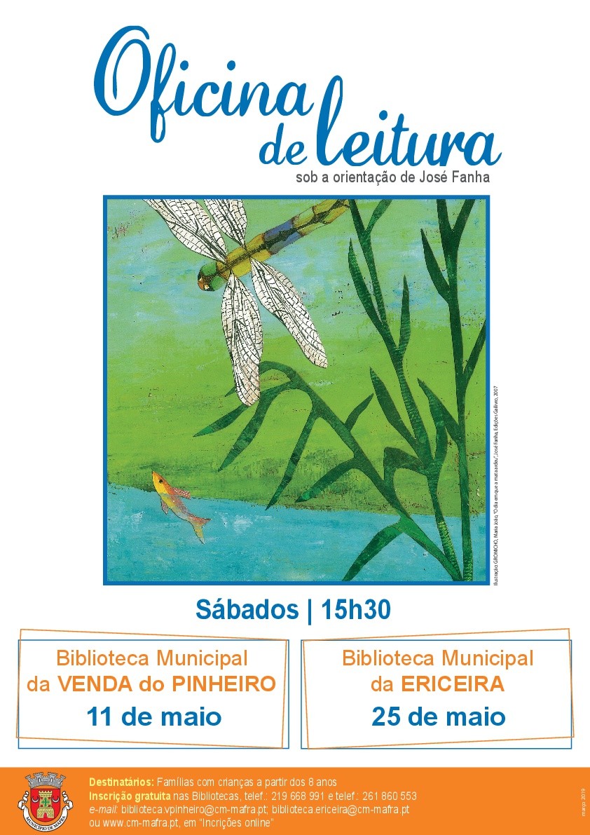Fomentando o prazer pelo livro junto dos mais jovens, contribuindo para o seu desenvolvimento intelectual, a Câmara Municipal de Mafra convida à participação numa Oficina de Leitura orientada pelo escritor José Fanha. A iniciativa realiza-se, às 15h30, nos sábados, dia 11 de maio, na Biblioteca Municipal da Venda do Pinheiro, e no dia 25 de maio, na Biblioteca Municipal da Ericeira. A atividade é gratuita, mas requer inscrição prévia.