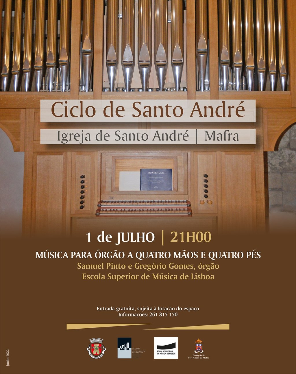 A Igreja de Santo André, em Mafra, acolhe o segundo concerto de órgão do Ciclo de Música de Santo André. O espetáculo está agendado para o dia 1 de julho, às 21h00, sendo protagonizado pelos alunos da Escola Superior de Música de Lisboa e pelos organistas Gregório Gomes e Samuel Pinto.