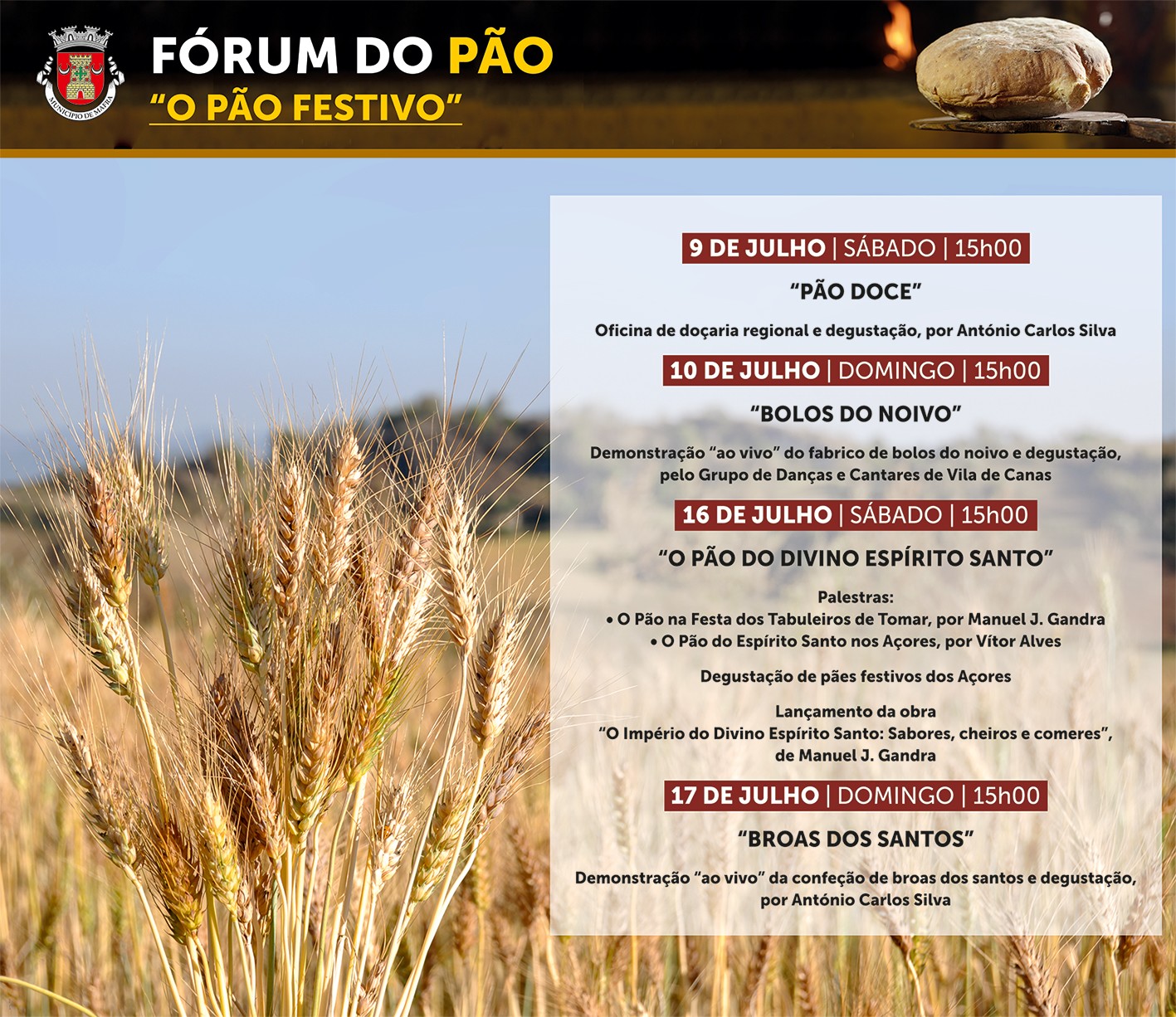Intitulado “Pão Festivo”, o fórum disponibiliza palestras, oficinas práticas, degustações e sessões de showcooking sobre fabrico de pão caseiro e doçaria regional, estando ainda patentes exposições sobre o papel deste alimento nas tradicionais festas dos Tabuleiros de Tomar e do Divino Espírito Santo, nos Açores.