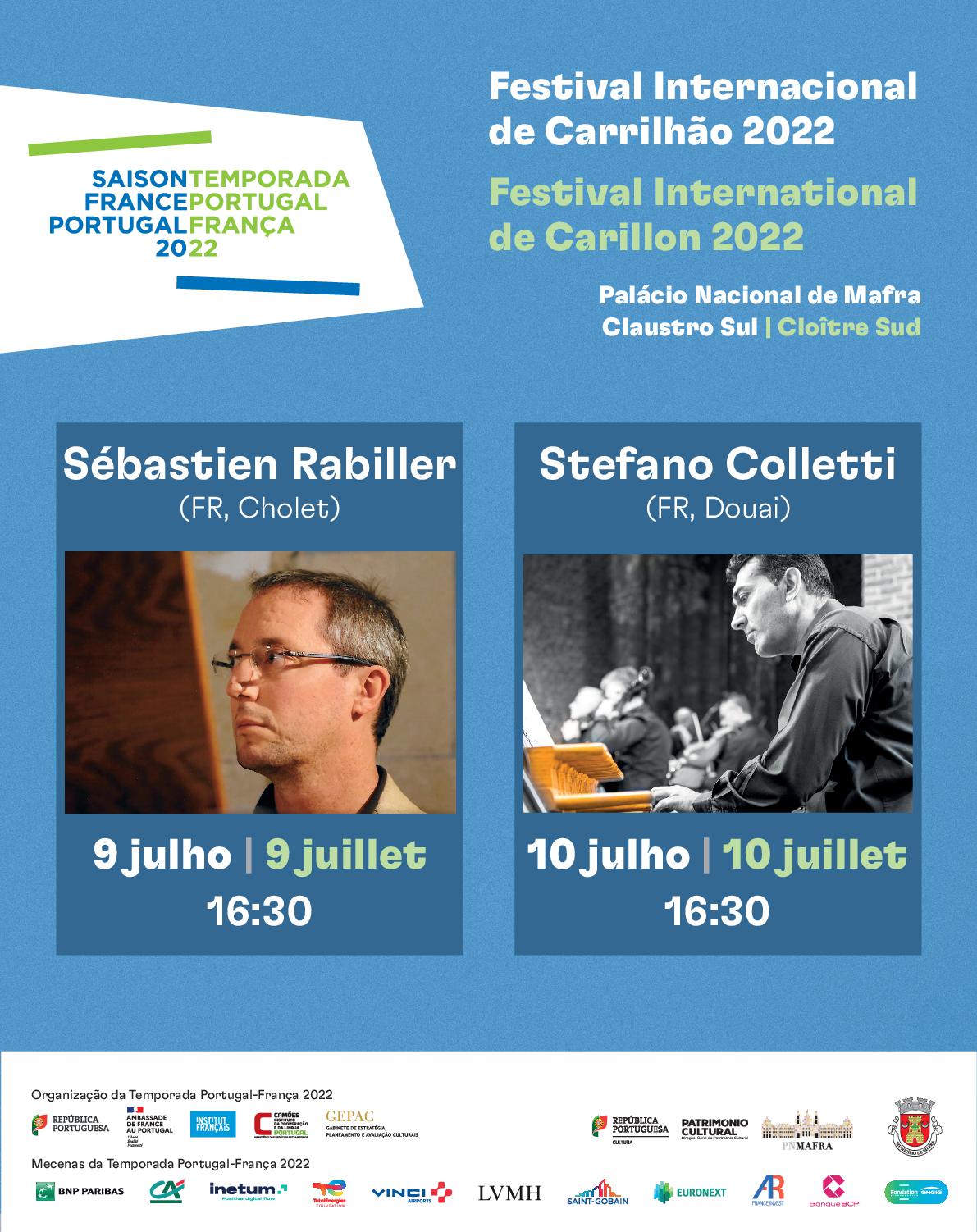 O Festival Internacional de Carrilhão decorre até 31 de julho, organizado pelo Palácio Nacional de Mafra e pelo Município de Mafra, no âmbito da Temporada Cruzada Portugal – França 2022, integrando dez concertos gratuitos protagonizados por carrilhanistas dos dois países.