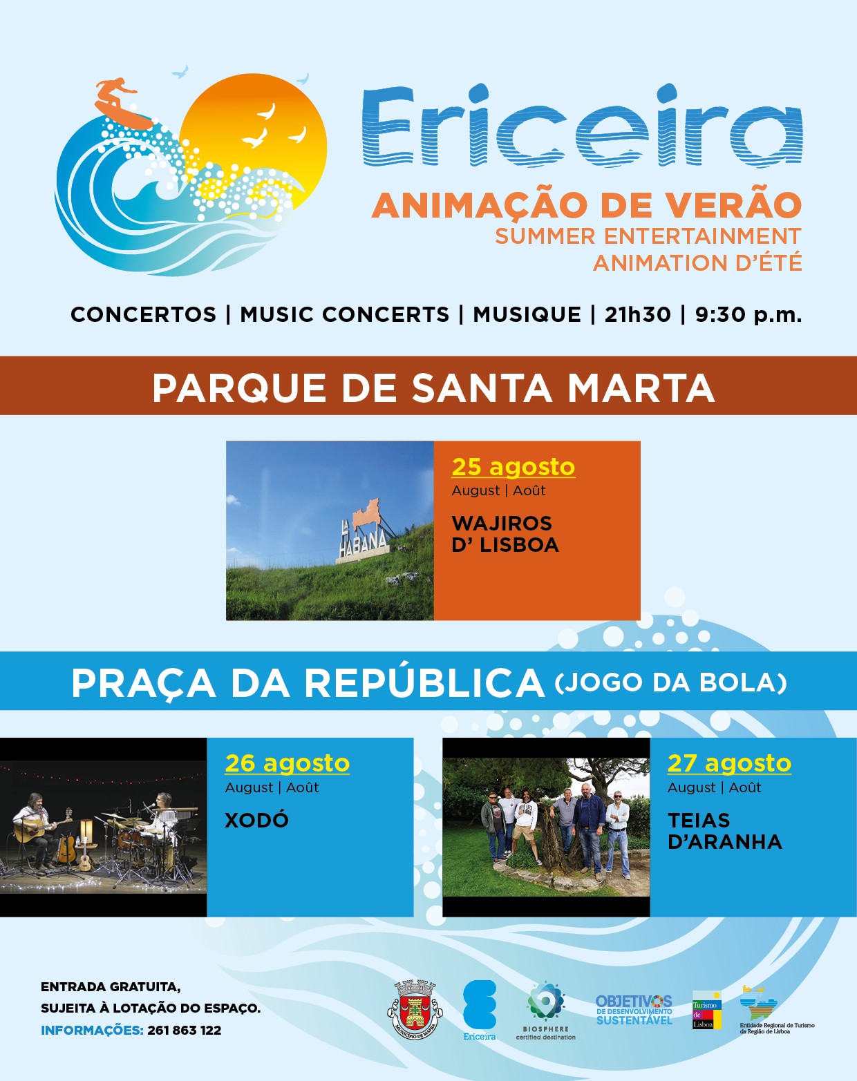 Os concertos no âmbito da Animação de Verão da Ericeira regressam já na próxima semana, com espetáculos marcados para o dia 25 de agosto, no Parque de Santa Marta, e para os dias 26 e 27, na Praça da República (“Jogo da Bola”). Todos os espetáculos se realizam às 21h30.