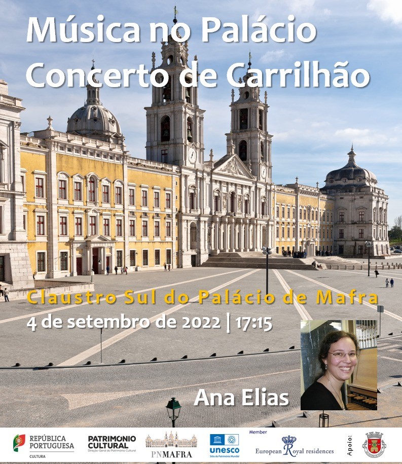 Realiza-se no domingo, dia 4 de setembro, pelas 17h15, um concerto de carrilhão. O público pode ouvir, no Claustro Sul do Real Edifício de Mafra, alguns sucessos da música popular, intercalados com grandes clássicos da música portuguesa e internacional, interpretados pela carrilhanista Ana Elias.