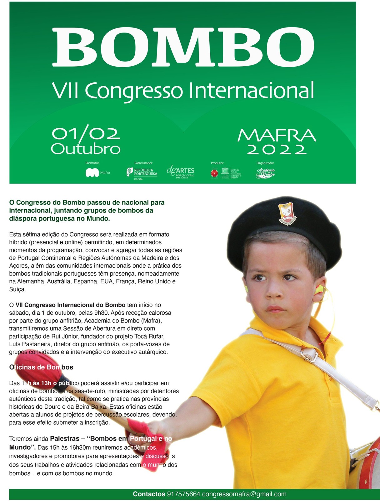 Nos dias 1 e 2 de outubro, o Concelho de Mafra recebe um congresso dedicado ao Bombo, juntando grupos nacionais e internacionais. A realização deste congresso tem como objetivo agregar instituições, artistas e pessoas ligadas à percussão tradicional portuguesa, proporcionando a troca de ideias, em torno desta arte popular.