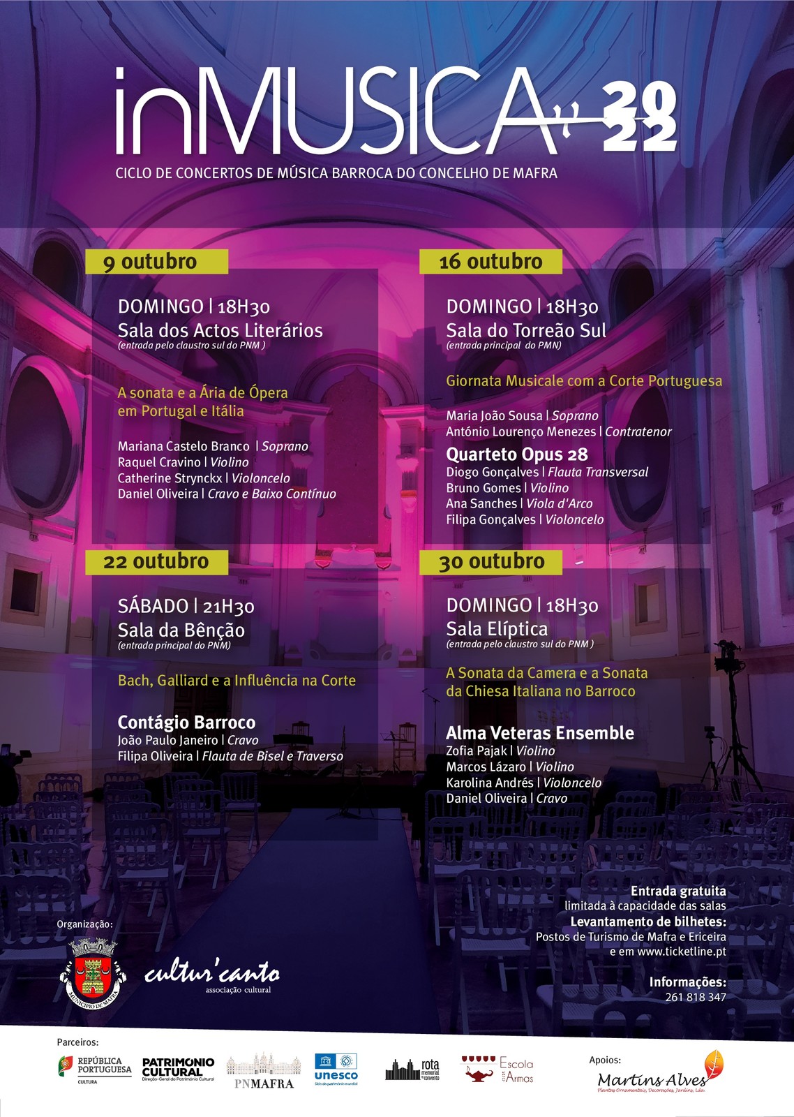 O Real Edifício de Mafra volta a acolher o inMusica – Ciclo de Música Barroca do Concelho de Mafra, organizado pela Câmara Municipal e pela Cultur’canto – associação cultural. De 9 a 30 de outubro, realizam-se quatro concertos onde a história nacional e internacional se conjuga com o presente, num diálogo entre a música barroca e a renascentista.